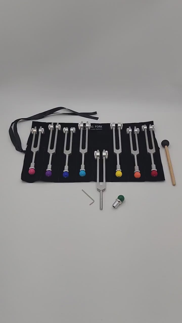 Chakra Tuning Fork Set of 8 Weighted Tuning Forks with Color Coded BUDDHA BEADS
