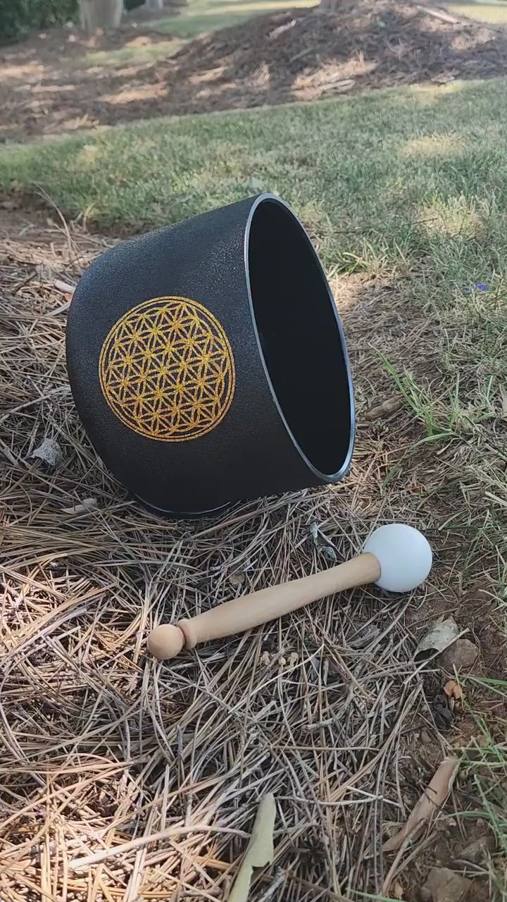 Each singing bowl is meticulously handcrafted by skilled artisans who pour their heart and soul into every detail. The deep black crystal surface provides a striking contrast to the intricate gold-colored Flower of Life design, which is carefully etched onto the bowl.