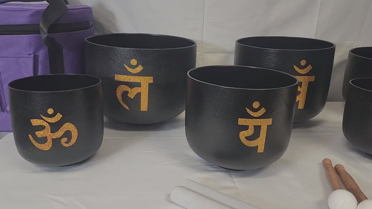 Harmony Unveiled: 432Hz Perfect Pitch Chakra Crystal Singing Bowls Set in Elegant Black with Gold Sanskrit Chakra Symbols